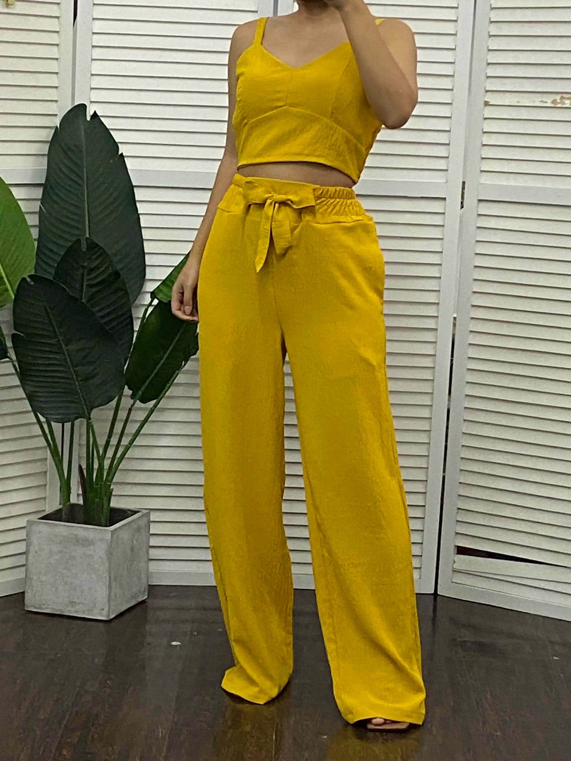 Tow Piceses Outfits for Women V-Neck Sleeveless Shirred Crop Top & Pocket Design Elegant Work Lady Wide Leg Pants Set